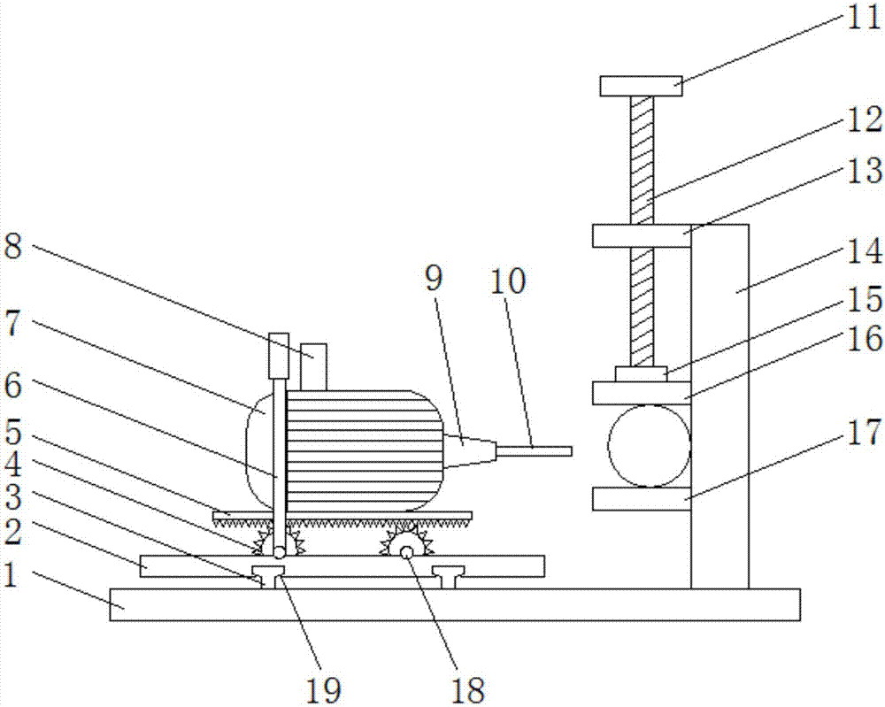 图中:1-底座;2-支撑杆;3-滑轨;4-齿轮;5-齿条;6-摇杆;7-电机;8-扶手;9-钻头夹;10-钻头;11-转盘;12-螺杆;13-第一固定块;14-支撑柱;15-轴承;16-活动块;17-第二固定块;18-滚轴;19-滑槽。