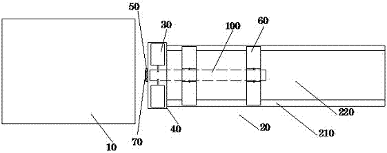 本实施例中,所述的活动顶板50下端经扭簧铰接于导轨40,所述活动顶板下端朝向卸料平台的一侧具有固定于导轨防止活动顶板反向旋转的限位板70,这样活动顶板50能够相输送平台20一侧翻转以避免对纸管进入的干扰,当纸管滑落至输送平台20上方的支撑架60后,在扭簧的作用下活动顶板50回复位置,受限于限位板60的作用保持数值,活动顶板50的作用是在于纸管在进行钻孔时进行限位,以使纸管100的端部抵顶活动顶板50,从而保证钻孔位置的准确。